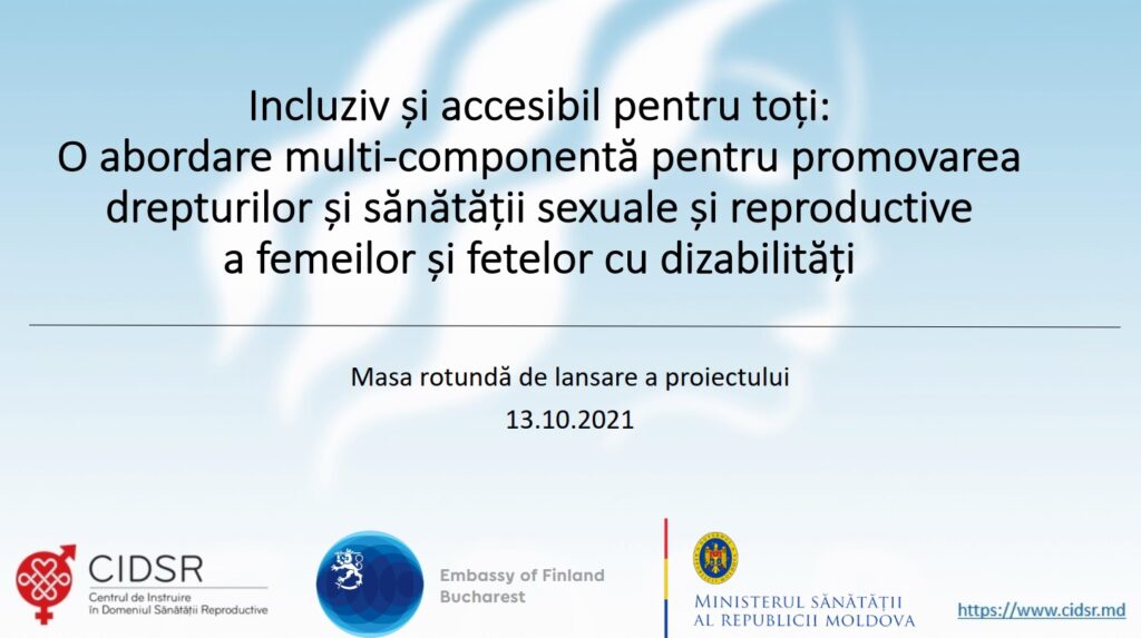 Peste 40 de femei și fete cu dizabilități vor fi capacitate în a-și exercita drepturile sexuale și reproductive în cadrul Proiectului „Incluziv și accesibil pentru toți: O abordare multi-componentă pentru promovarea drepturilor și sănătății sexuale și reproductive a femeilor și fetelor cu dizabilități”. În urma activităților proiectului, fetele și femeile cu dizabilități vor avea posibilitatea să transmită cunoștințele acumulate în ceea ce privește drepturile la sănătatea sexuală și reproductivă (DSSR) altor femei și fete cu dizabilități, dar și altor persoane din comunitate. Proiectul a fost lansat miercuri, 13 octombrie, de către Centrul de Instruire în Domeniul Sănătății Reproductive (CIDSR), în cadrul unei mese rotunde desfășurate în regim online.