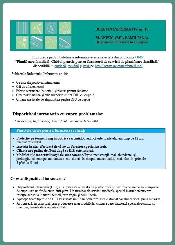 Un suport informațional adițional, publicațiile OMS și documentele MS îl găsiți și la compartimentul ”Planificarea familială”, creat pe pagina web a CIDSR.
