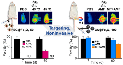 Исследователи протестировали в качестве мужских контрацептивов две формы наночастиц оксида железа, которые являются биоразлагаемыми и могут направляться и нагреваться магнитным полем. Один тип наночастиц был покрыт полиэтиленгликолем (ПЭГ), а другой — лимонной кислотой. Хотя наночастицы, покрытые ПЭГ, можно было нагревать до более высоких температур, ими гораздо сложнее манипулировать с помощью магнитов, чем другими наночастицами. Поэтому исследователи вводили повторные дозы покрытых лимонной кислотой наночастиц в кровоток мышей в течение 2 дней, с помощью магнитов направляли наноматериалы к тестикулам, а затем на 15 минут прикладывали к этой области переменное магнитное поле. Наночастицы нагревали семенники до температуры 40°C, сокращая их и подавляя сперматогенез до постепенного восстановления через 30-60 дней после воздействия. Через 7 дней после лечения мыши не могли дать потомство, но на 60-й день они снова стали давать около 12 детенышей на одну беременную самку. Наночастицы были нетоксичны для клеток и постепенно выводились из организма, что открывает новые возможности для мужской контрацепции, утверждают исследователи.