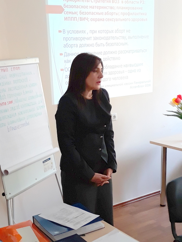 Д-р Оксана Чебан, зав. Центром Репродуктивного Здоровья, г. Тирасполь доложила в своей презентации о достигнутых результатах за 2017-2018 гг. в рамках проекта SAAF. Было отмечено, что в данном проекте были проведены 4 тренинга по планированию семьи, во время которых 90 врачей повысили свою квалификацию; были разработаны информативные материалы для врачей а также 4 протокола по методам планирования семьи, основанных на рекомендациях ВОЗ, и впервые были закуплены контрацептивы с международной платформы ACESS RH.
