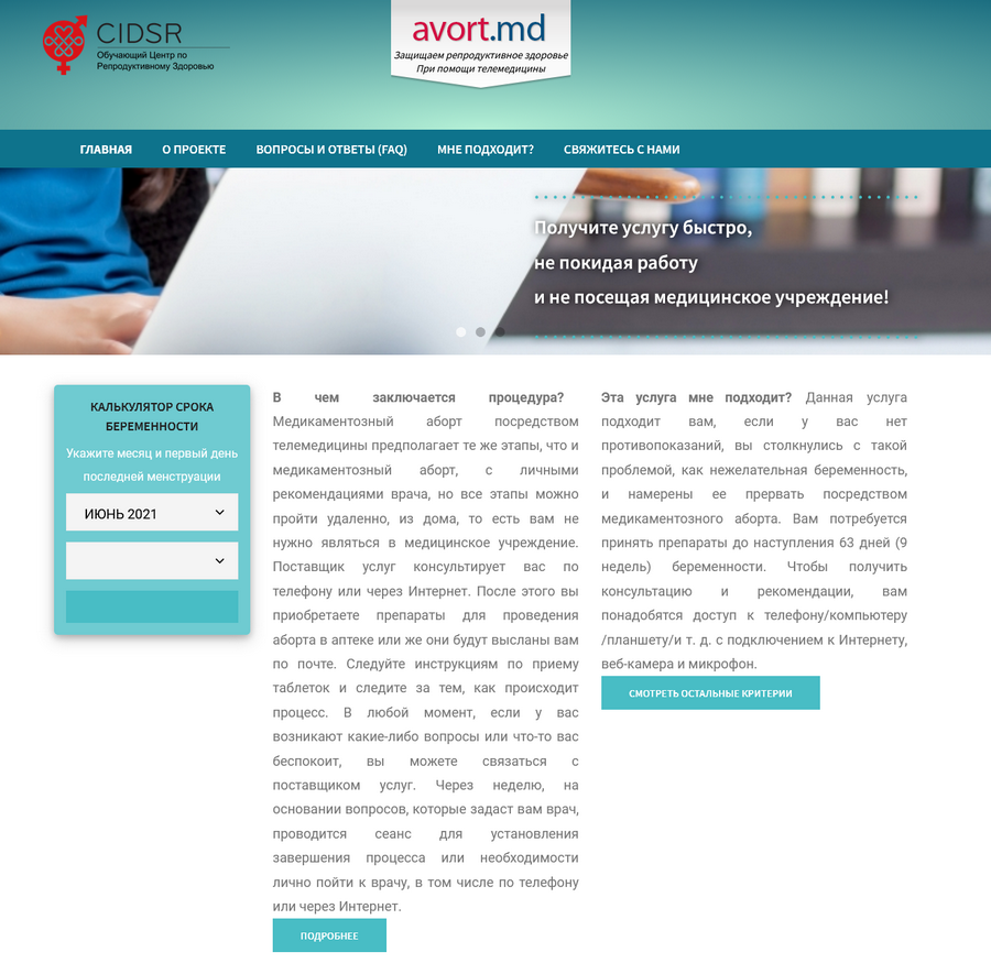 Результаты пилотного исследования «Медикаментозный аборт посредством телемедицины для женщин и подростков в сельской местности Молдовы» одобрены Национальным комитетом по этической экспертизе клинических исследований (№ 754 от 30.10.2019) За 13 месяцев (март 2020 — май 2021 гг.) было проведено 549 скринингов и в исследование были включены 531 беременная женщина и подросток на сроке беременности ≤ 9 недель.