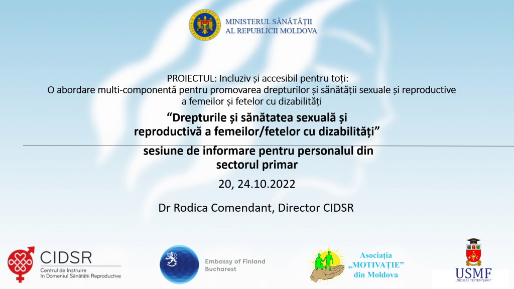 Информационные сессии были проведены в рамках проекта «Инклюзивный и доступный для всех»: Многокомпонентный подход к укреплению сексуального и репродуктивного здоровья и соблюдению прав женщин и девочек с ограниченными возможностями», при финансовой поддержке Посольства Финляндии в Бухаресте в рамках Фонда местного сотрудничества.