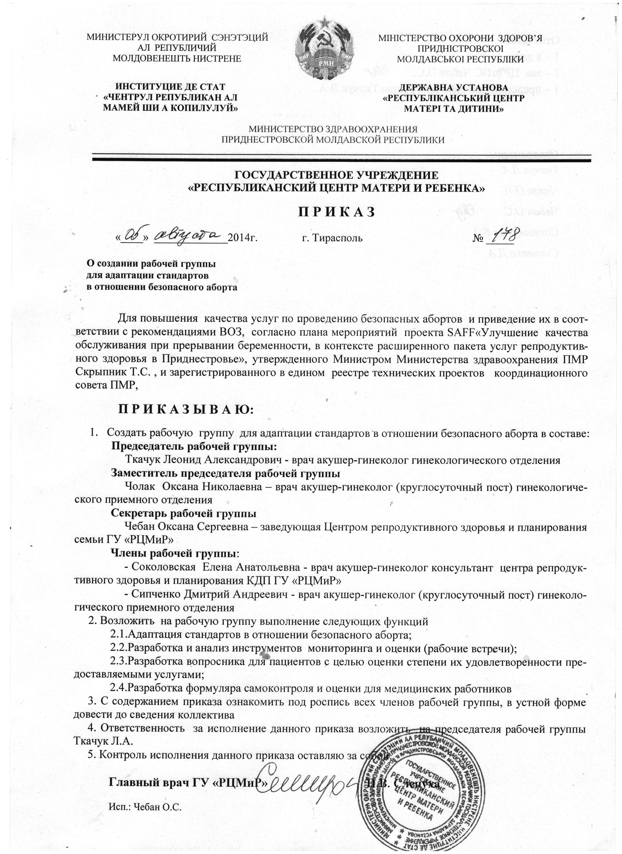 Приказ   Республиканского Центра Матери и Ребенка «О создании рабочей группы для адаптации стандартов в отношении безопасного аборта» был утверждён 05 августа 2014 года.